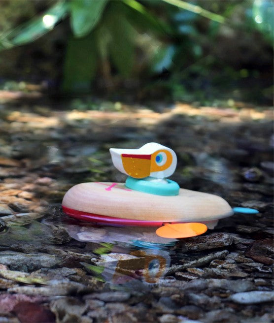 Diversão louca na água com o pequeno pelicano! Este lindo pelicano de madeira na sua canoa proporcionarão uma grande diversão na hora do banho.