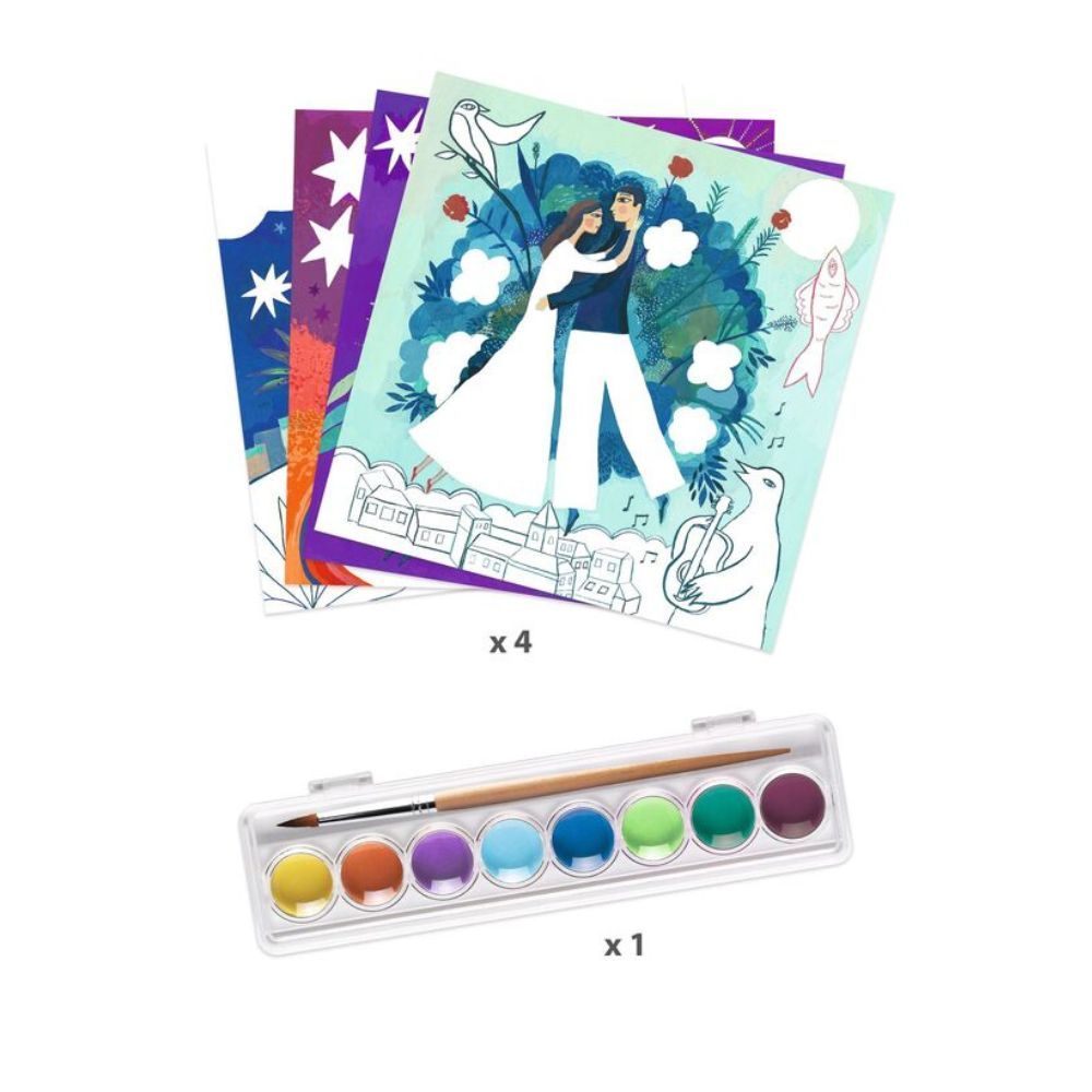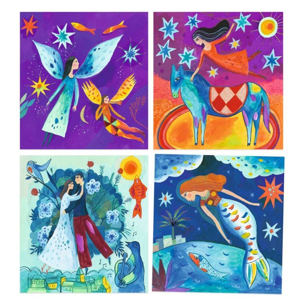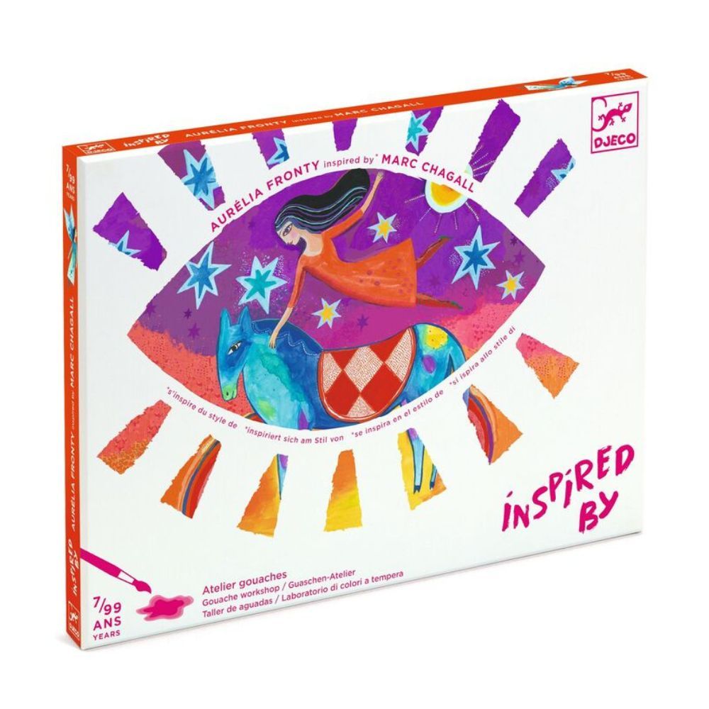 Actividades de pintura com ilustrações inspiradas no estilo do grande mestre surrealista Marc Chagall.