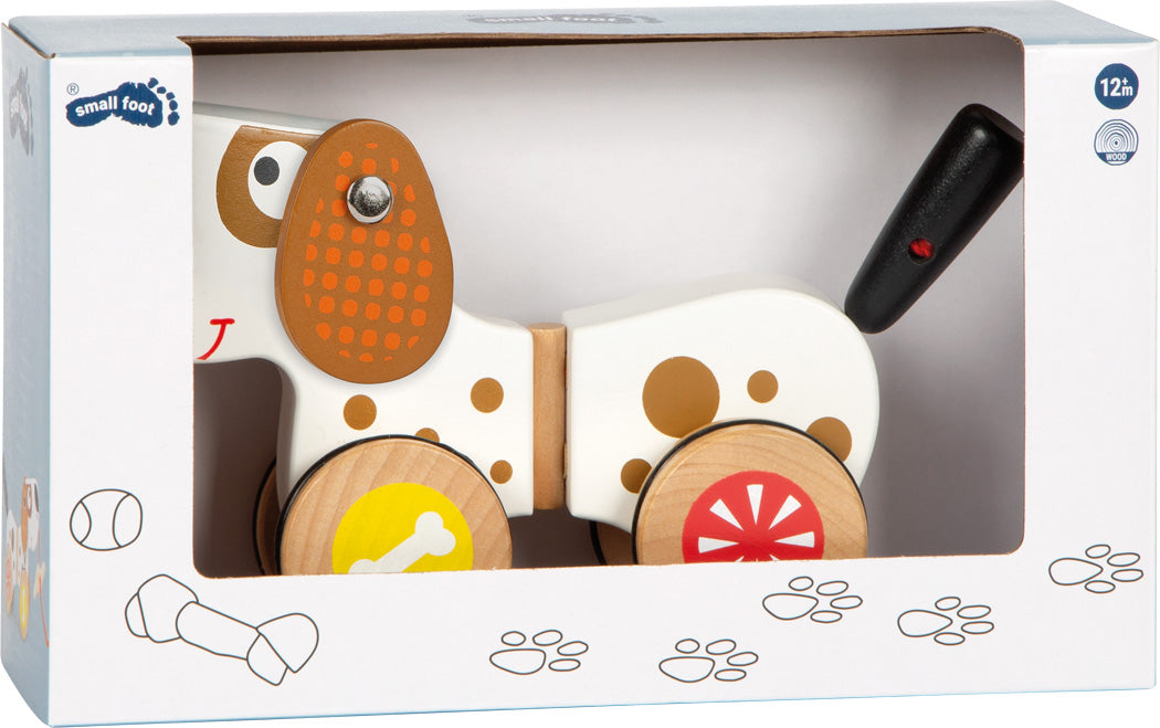 As suas rodas possuem anéis de borracha para diminuir o ruído. Abana as orelhas e a cauda.