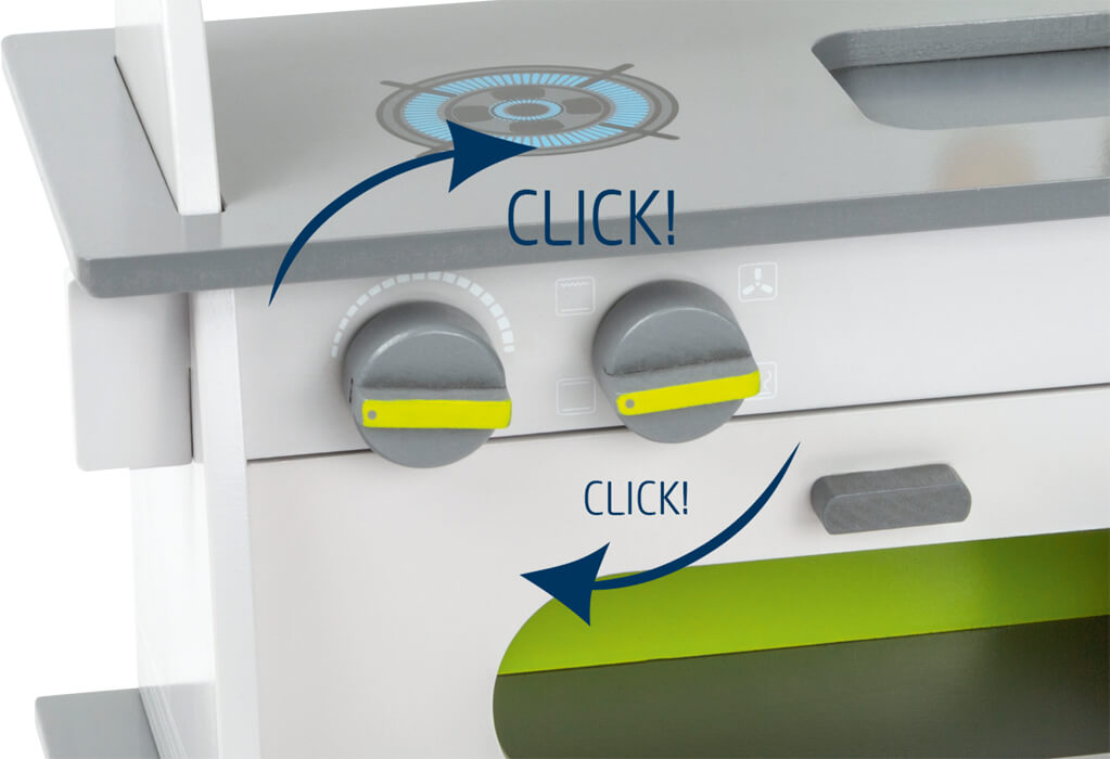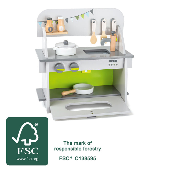 Esta cozinha de madeira totalmente equipada tem tudo o que os jovens chefs precisam para preparar um banquete!
