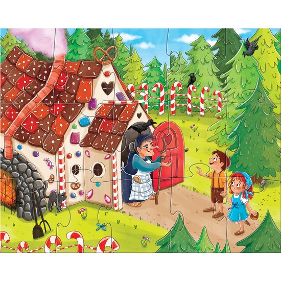 Um conjunto de 4 puzzles acompanhados por figuras de madeira.