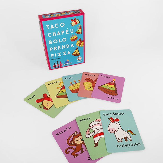 Taco Chapéu Bolo Prenda Pizza! Fixa estas 5 palavras disparatadas na tua cabeça. Assim que houver correspondência entre uma carta e a palavra que foi anunciada, apressa-te a pôr a tua mão em cima da pilha central. O último jogador a pôr a mão deve receber todas as cartas. Deves ser rápido para conseguires ser o primeiro a livrar-te de todas as tuas cartas. Tem cuidado! a tua mente vai pregar-te partidas. Diverte-te com este jogo de cartas alucinante!