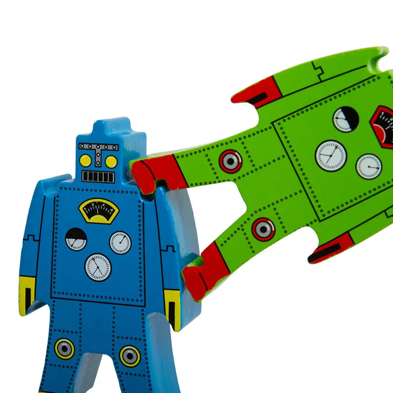 Neste bonito brinquedo de madeira, os robôs podem ser empilhados uns sobre os outros de diferentes formas.